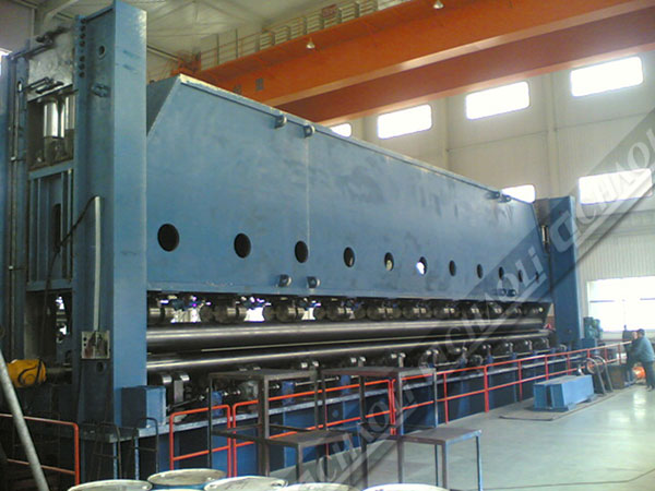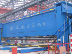 船用三輥對(duì)稱式卷板機(jī)結(jié)構(gòu)型式為三輥對(duì)稱式,上輥在兩下輥中央對(duì)稱位置作垂直升降運(yùn)動(dòng),通過液壓缸內(nèi)的液壓油作用于活塞桿而獲得,為液壓傳動(dòng);通過特殊設(shè)計(jì)減速機(jī)分別帶動(dòng)全滾動(dòng)軸承的兩下輥?zhàn)餍D(zhuǎn)運(yùn)動(dòng),為卷制板材提供扭矩;在下輥下部設(shè)有多組托輥,以提高下輥的剛度,并可進(jìn)行垂直調(diào)節(jié);在上輥的上部設(shè)有剛性大梁,在大梁與上輥之間設(shè)有多組托輥,以提高上輥的剛度;適用于超寬圓弧形零件的卷制。可卷板厚3mm-50mm,板寬21000mm的板料。