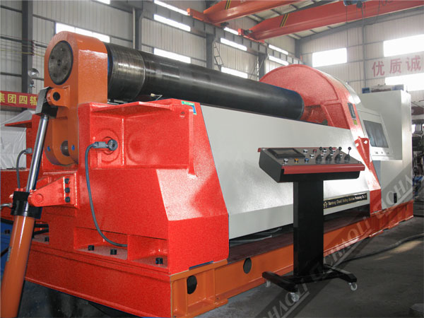 該W12數控四輥卷板機具有板材端部的預彎功能,能將金屬板材一次上料,不需調頭即可完成板端預彎和工件的卷制成形。該機上工作輥為主驅動輥,下輥和兩側輥的升降均采用液壓傳動,升降位移由計算機控制,自動調平,屏幕顯示,翻轉軸承體的傾倒和復位采用液壓傳動,上輥的尾部裝有平衡機構,可以方便卸出卷制后的工件及筒體。設有移動式Du立操作臺,可隨時移動操作,機器設有安全聯鎖裝置,該機技術水平高,功能全,精度高,操作方便。是能源、交通、石油、化工、鍋爐、造船、水電、金屬結構等行業卷制圓形、弧形和錐形工件理想的機型。